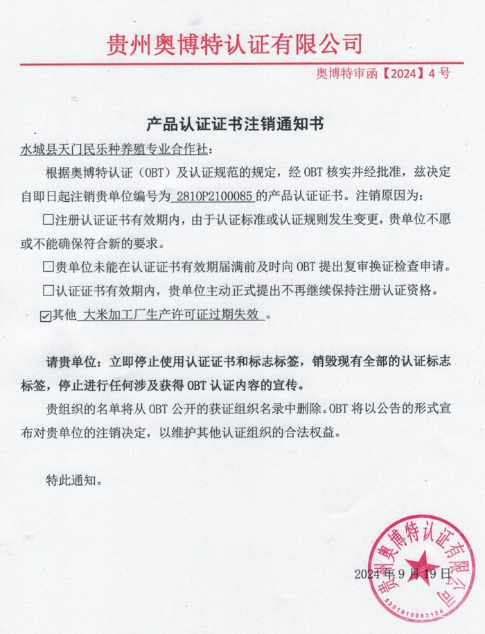 注銷水城縣天門民樂種養殖專業合作社產品認證證書通知